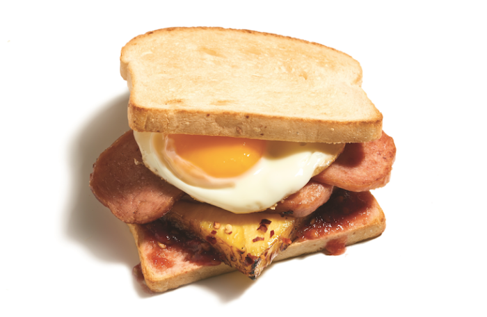17. Holiday in Waikiki: grilled pickled pineapple, sunny-up, fried ham, pan con tomate