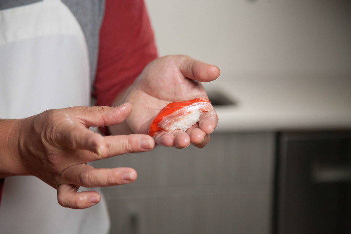 7. Place the thinly sliced fish in your hand — again, at the base of your fingers — and add a small dab of wasabi to the center of the fish. This adds a touch of heat but also helps the fish stick to the rice. Next, place the rice on top of the fish and press down gently with your pointer finger. Flip the piece of sushi over so that the fish faces up, and repeat the same steps as before: shape, cradle, rotate. Do this three times total.