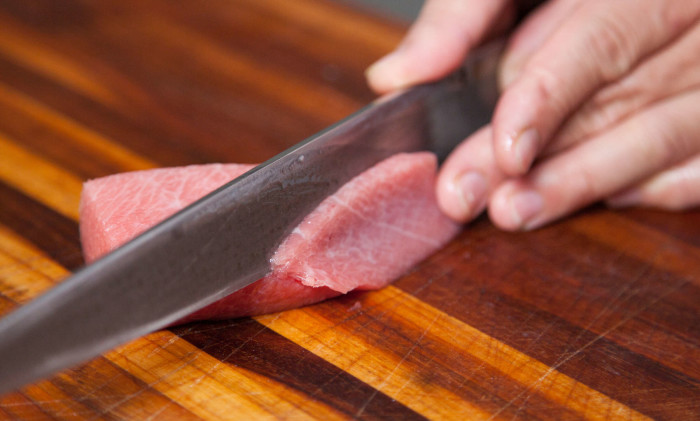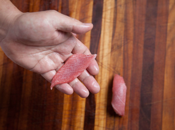 6. Thinly slice the fish of your choice and add it to your workstation. Albacore tuna belly, anyone? Perhaps some locally caught salmon? Make sure that knife is razor sharp: fresh fish is super delicate, and you want to keep it looking silky smooth, with nice, clean edges. Want to learn more about how to properly slice fresh fish for sushi? There are tons of great videos on YouTube — here's a good place to start.