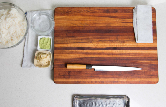 2. Set up your workstation: To make nigiri at home, you'll want a cutting board, a chef's knife, a damp towel, lukewarm water, pickled ginger, wasabi, and sushi rice.