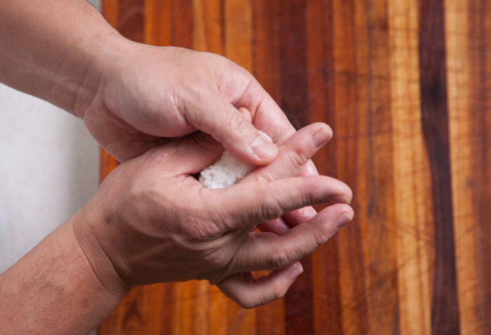 3. Wet your hands: This keeps the rice from sticking to your palm or fingers as you shape it.