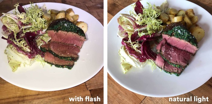 We know it might be tempting to add some brightness to a dark dish, but please, fight this desire. The flash creates super-harsh light, which will bounce off of anything shiny or any bit of moisture on your plate, making it look totally unappealing. It can also create some odd shadows, which will not do your food any favors. If you need more light, move your food into another room with a stronger light source, try brightening the photo afterward with an editing app on your phone, or just enjoy the food and save the photo shoot for another day.