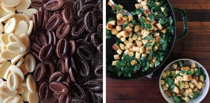 When you want to show off your dishes and hide any imperfections, sometimes more really is more. A hundred little handmade chocolates are much more impressive than one perfect piece. Using a hundred chocolates also means you don't need to find that perfect piece—your audience will be looking at the whole shot rather than each little chocolate. Likewise, when making a big, family-style dish, consider showing the serving plate along with individual portions.