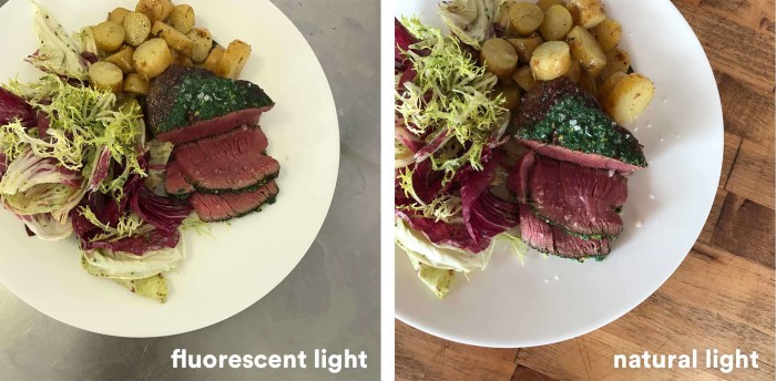 The colors in your food photos can end up looking off if you're not shooting in natural light. No matter what you do, the artificial lighting in your home will never be as good as natural light, but it is possible to do some color correcting. Apps like VSCO, Snapseed, and Afterlight let you edit your smartphone photos and adjust the color temperature (also known as white balance), brightness, contrast and more.