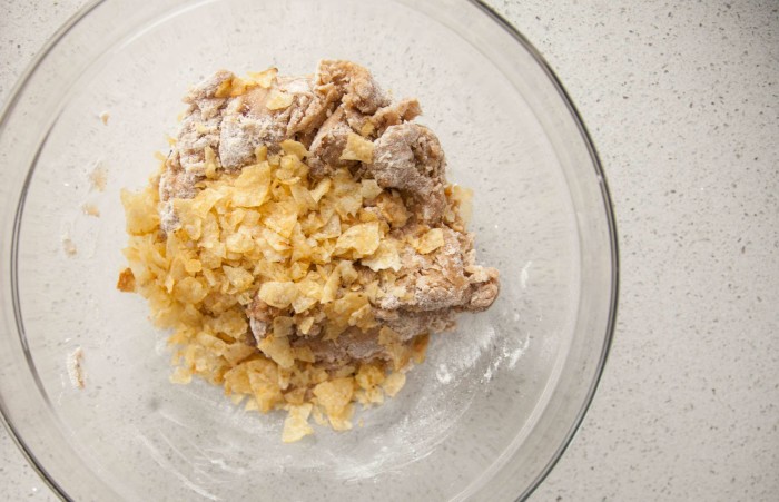4. Sift together the all-purpose flour and baking powder and mix into your wet ingredients. Gently fold in potato chip pieces for that extra salty crunch.