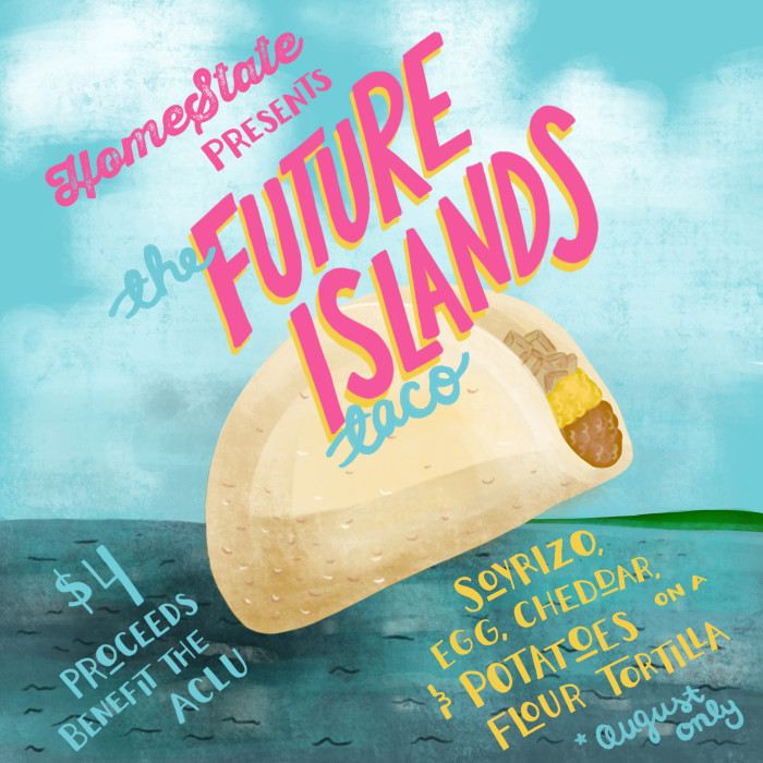 As though screamy synthpop stars Future Islands couldn't get any better, there's now a taco that was created in their honor. And not just any taco — a Texas-style breakfast taco, one of the greatest and most famous wonderful tacos of all time. The Future Islands taco, $4, at HomeState, a Mexican eatery in Los Angeles' Los Feliz neighborhood, is a hearty behemoth of scrambled eggs, cheddar, potatoes and Soyrizo on a flour tortilla. It's only available for the month of August, so get yours while they last!
