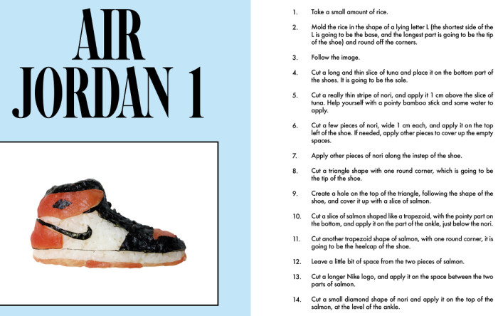 It's a golden era for sneakerheads who also love sushi. We've been following the incredible, edible art of Yujia Hu for some time. The Milan-based Italian-Chinese sushi chef and artist's fish and rice-based sneaker sushi creations are Instagram gold, and he knows it. Hu has started selling intricately detailed how-to guides so that you can replicate these sumptuous creations at home. Here's a preview of how to make his signature tuna-based Air Jordan: