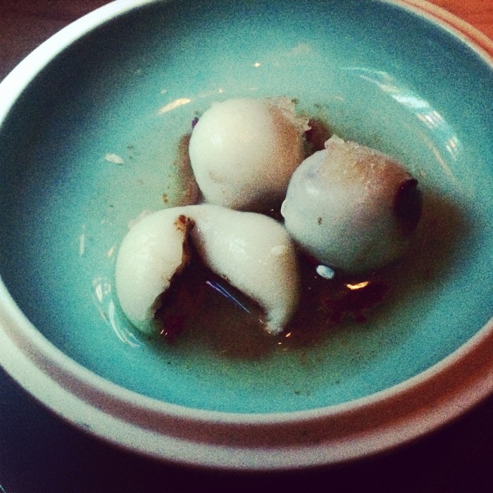 Sometimes filled with ice cream, strawberries or sweetened red-bean paste, this gummy, rice flour confection comes from Japan. Ong likes this dish particularly because of the "chewy texture," calling it "very lovely."