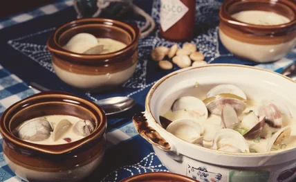 - Measure the miso into a small bowl and add a ladleful of the hot clam broth. Knead the miso with the back of a spoon until it dissolves into the broth, then pour the liquid back into the pan along with the cream. Season with salt to taste and a generous amount of pepper and stir in the scallion greens. Divide among 4 serving bowls and garnish as you see fit.