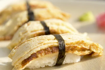 Tamago, or "grilled egg," is a type of Japanese omelet. It can be served with rice and seaweed as nigiri (pictured above) and is often enjoyed as a bridge between savory and sweet courses during a sushi meal. While preparing tamago can be as simple as combining eggs, rice vinegar, sugar and soy sauce and cooking over low heat, the additions of Japanese mountain yam and shrimp impart a savory element and form more of a custard texture. A particularly well-made piece of tamago can even bring one to tears. Just watch Jiro Dreams of Sushi.