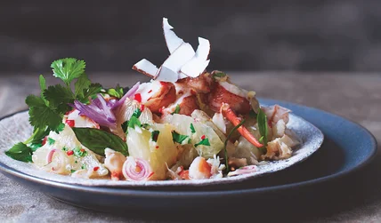 - Arrange the pomelo on plates and top with the lobster and crabmeat. Scatter with the cilantro and basil, and spoon over the remaining dressing. Finish with a flourish of shaved coconut and sliced shallots and serve immediately.