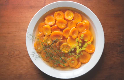 - Add the fennel fronds, peppercorns, and apricots to the hot syrup. Simmer until the fruit has softened but still holds its shape, 2-3 minutes. Remove the pot from the heat. Let the apricots cool in the syrup, stirring gently from time to time.